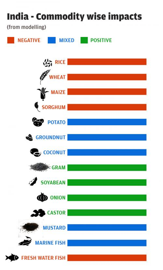 By 2030, rice and wheat are likely to see about 6-10 per cent decrease in yields. Rising temperature affects flowering and leads to pests and disease buildup. Flood and excess rain over a short duration of time cause extensive damage to crops.
